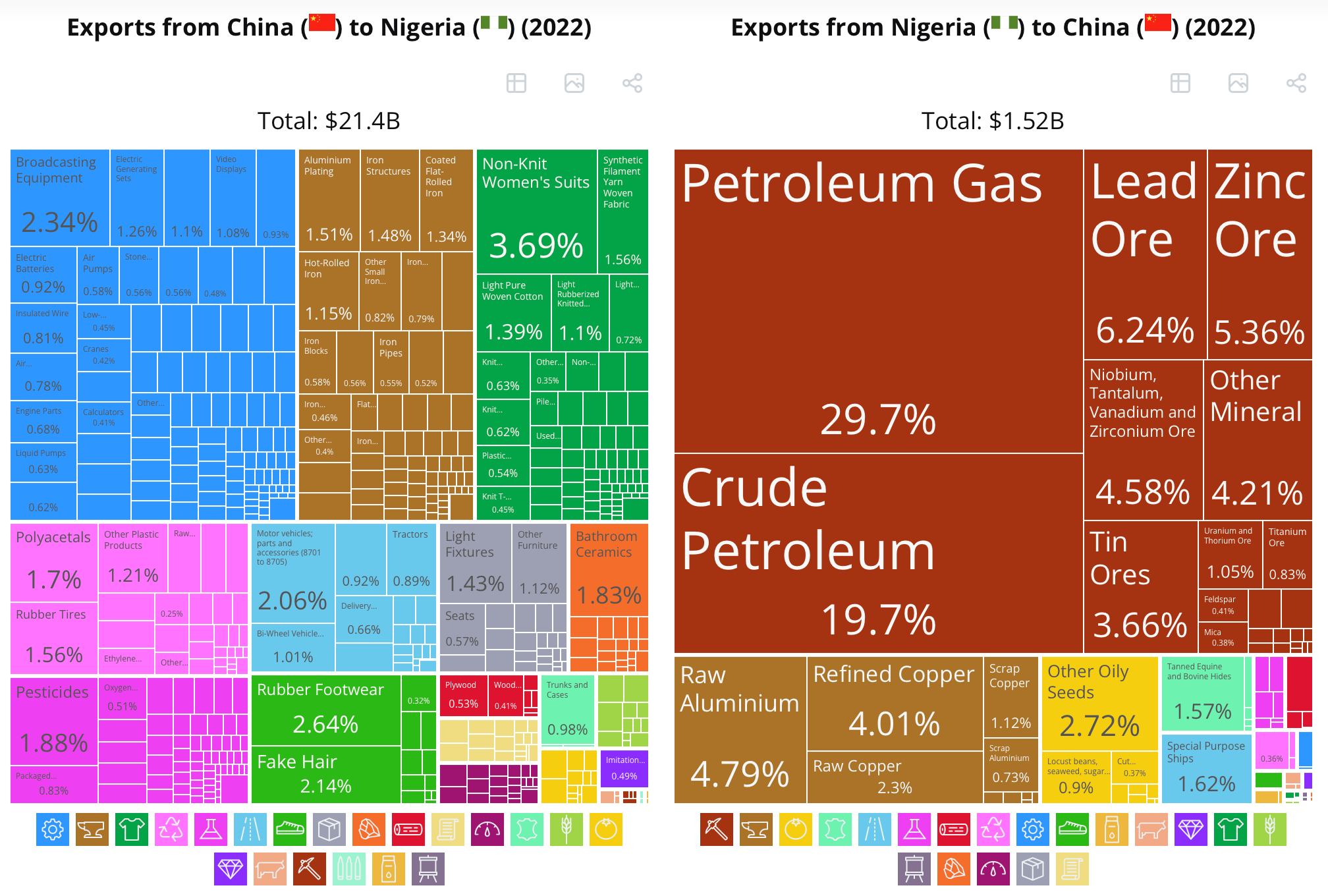 Data from the Observatory of Economic Complexity (OEC) shows that there is an ever expanding and endless list of products needed by Nigerians and the African market as a whole. While there is a limited range in the export products to China, there is potential opportunity to keep increasing the volumes of exports to China considering their population and demand for inputs into their manufacturing and export value chain.